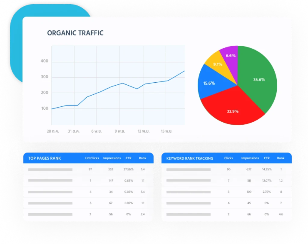 เราติดตามอันดับ Keyword และสรุปผลการทำ SEO ให้คุณทุกเดือน เพื่อให้ลูกค้าเห็นความเชื่อมโยงระหว่างอันดับ การเข้าชม และโอกาสทางธุรกิจ พร้อมคำแนะนำในการพัฒนาเว็บไซต์เพิ่มเติม เพื่อปรับปรุงคุณภาพและเพิ่มโอกาสในการติดอันดับบนหน้าแรก Google อย่างต่อเนื่อง